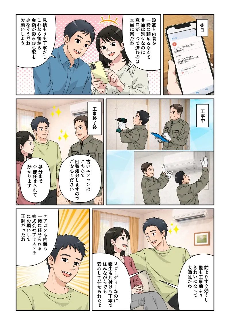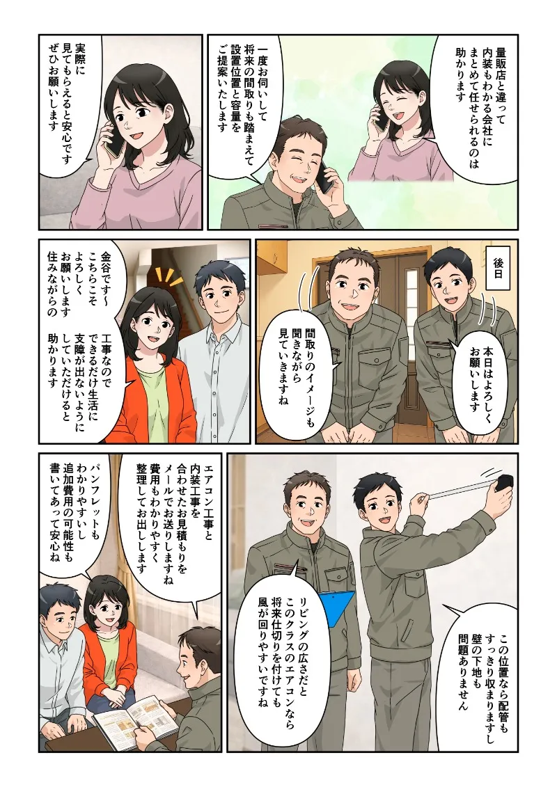 代表「エアコン工事と内装工事を合わせた見積もりをメールでお送りしますね。費用もわかりやすく整理してお出しします」
